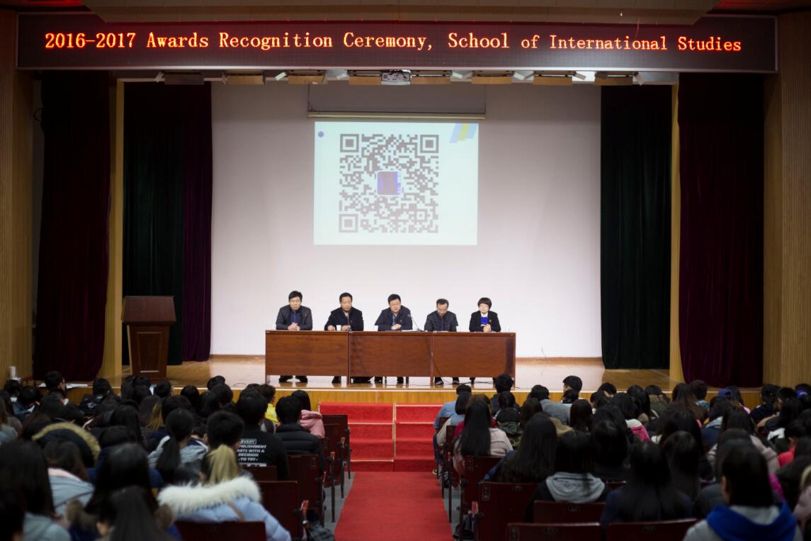 晚7:00,表彰大会在雄壮的国歌声中拉开帷幕,徐姝副院长宣读了《关于表彰国际教育学院本科项目2016-2017学年度第一学期先进集体和优秀个人的决定》,21人获学习优秀奖,51人获英语之星奖,3人获优秀学生干部奖,4人获道德风尚奖,5人获公益奉献奖,6人获十佳寝室长奖,8人获专业认知实习报告优秀奖。杨建副书记宣读了《关于表彰国际教育学院专科项目2016-2017学年度第一学期先进集体和优秀个人的决定》,117人获学习优秀奖,22人获学习进步奖,40人获英语技能奖,71人获专业技能奖,22人获优秀学生干部奖,9人获道德风尚奖,15人获公益奉献奖,10人获十佳寝室长奖,79人获文体竞赛奖,29人获专业认知实习报告优秀奖。本科项目贺沁莹、专科项目邓富尹等5名同学代表获奖学生发言,发表获奖体会,感谢学校提供的良好平台,表达对老师、同学的感恩之心。学院领导为获奖学生颁发了荣誉证书。
